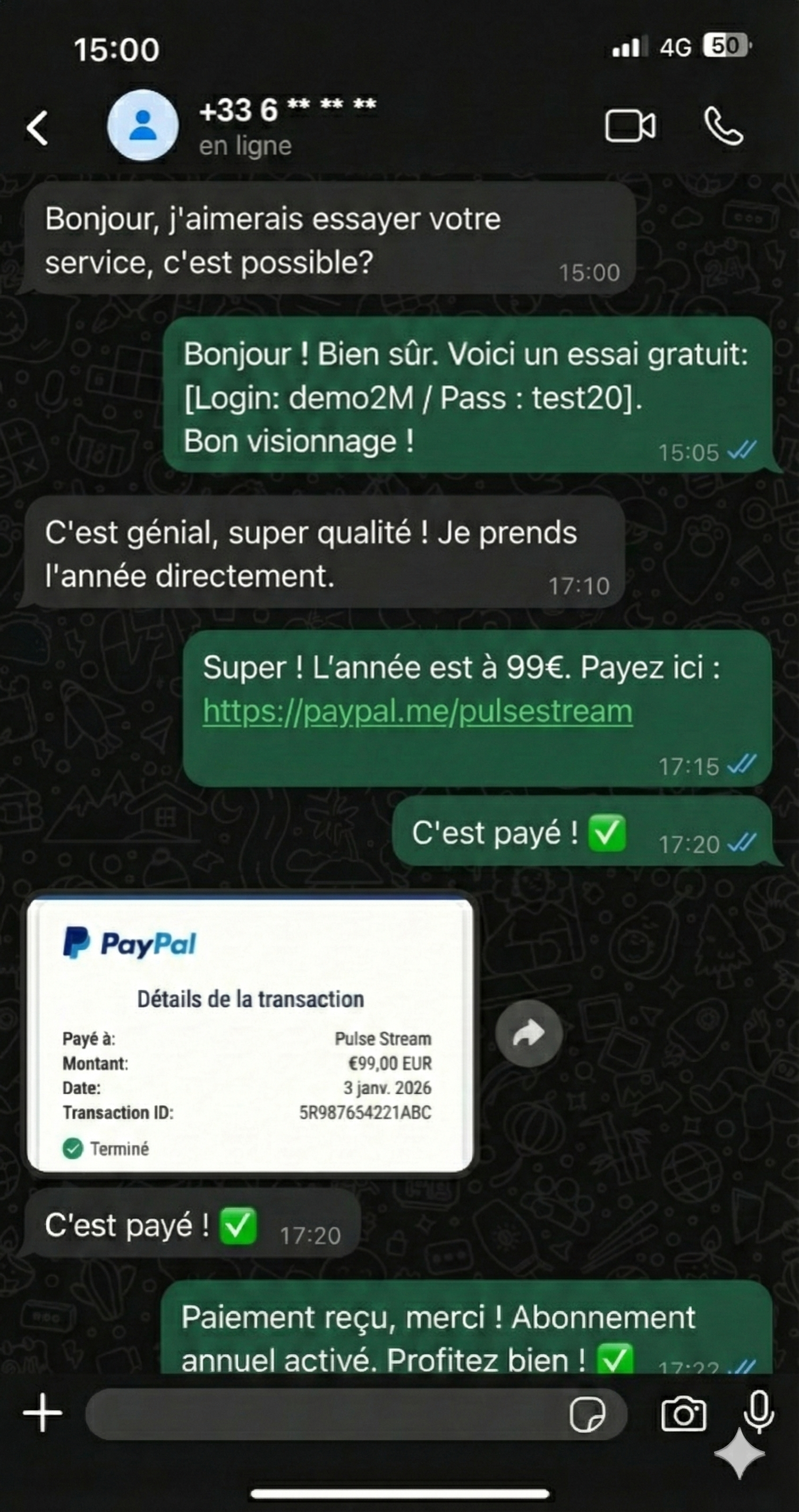 Configuration simple de votre abonnement IPTV sur Smart TV, Boitier Android, Fire Stick ou PC. Nous fournissons les codes Xtream et m3u instantanément après l'achat.